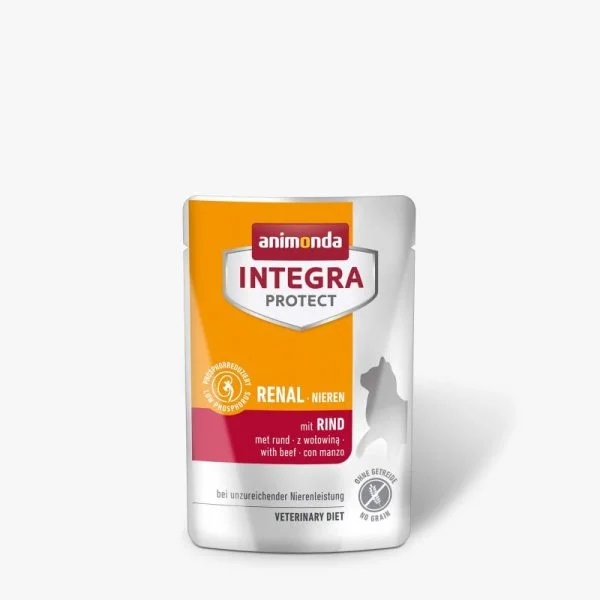 INTEGRA PROTECT Renal cu vită a fost dezvoltată de veterinari și este perfect adaptată cerințelor nutriționale speciale ale pisicilor cu insuficiență renală cronică. Această hrană dietetică specială este foarte atractivă pentru pisicile cu probleme renale.